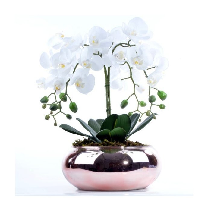 Características do Arranjo com 4 Orquídeas Brancas Centro de Mesa Rose Gold: