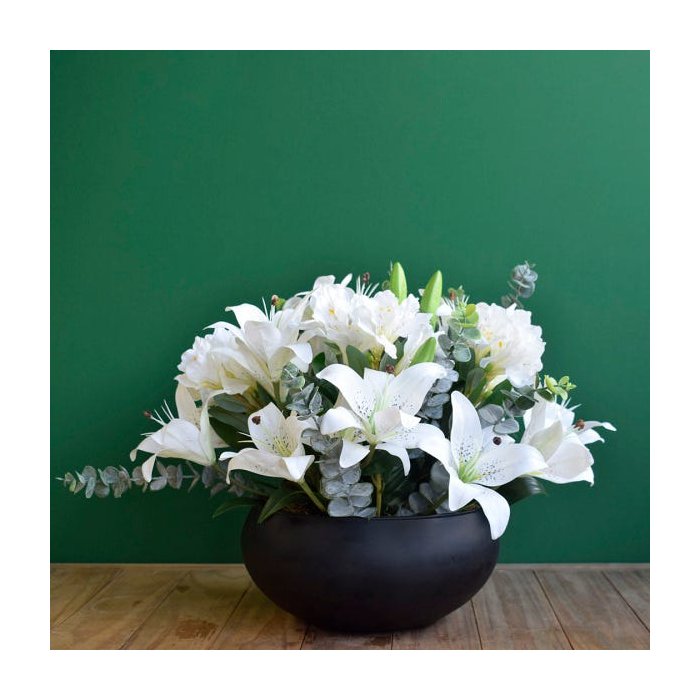 Arranjo de Flores Artificiais de Lírios e Astromélias no Vaso Preto Fosco