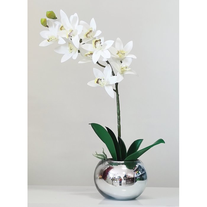 Arranjo De Flores Orquídea Branca 3D Vaso Espelhado Prata
