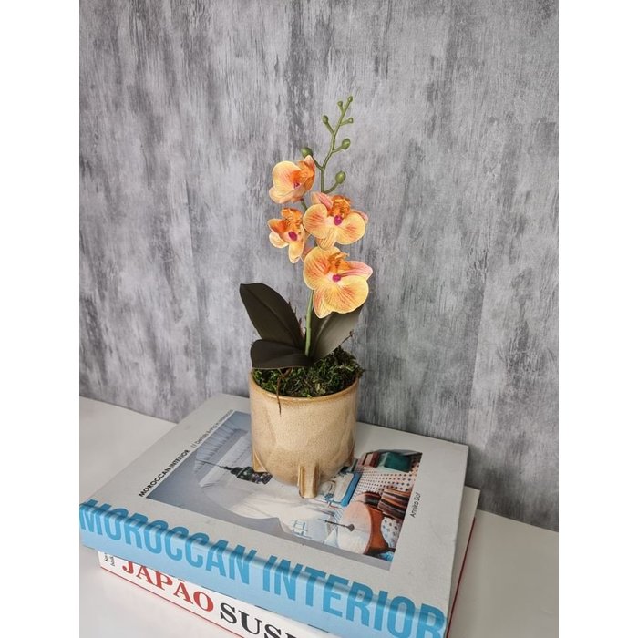 Arranjo De Mini Orquídea Laranja Vaso Bege Redondo Laranja