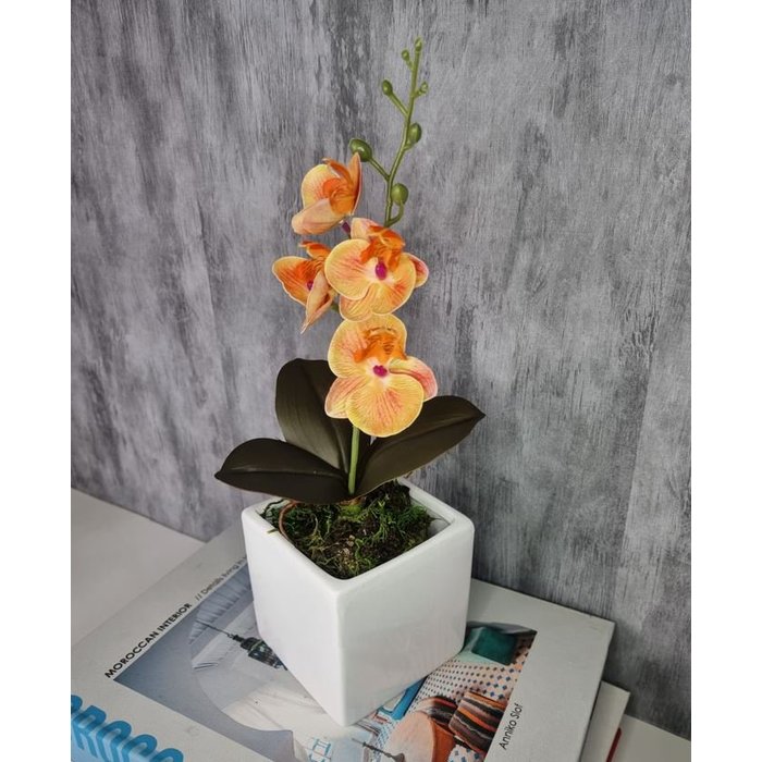 Arranjo De Mini Orquídea Laranja Vaso Branco Quadrado Laranja