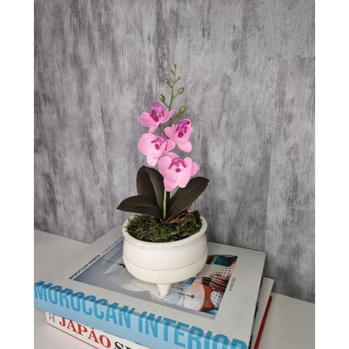 Arranjo De Mini Orquídea Rosa Vaso Bege Claro Redondo