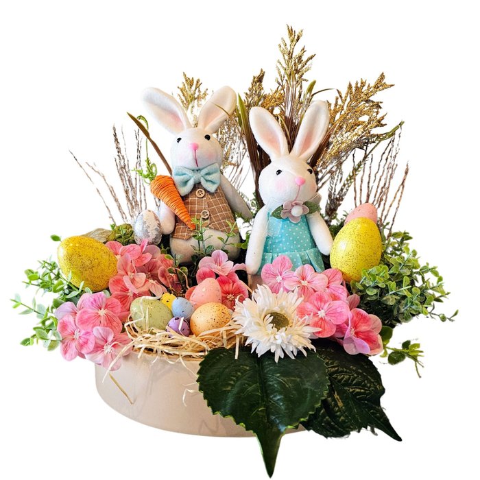 - Qualidade Premium: Utilizamos apenas as flores permanentes de mais alta qualidade, garantindo a beleza deste arranjo ao longo da temporada de Páscoa.