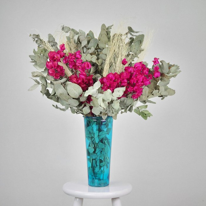 Arranjo Desidratado Brisa Eucalipto Aromático e Bougainvillea Rosa Escuro+ Vaso Azul Plantô