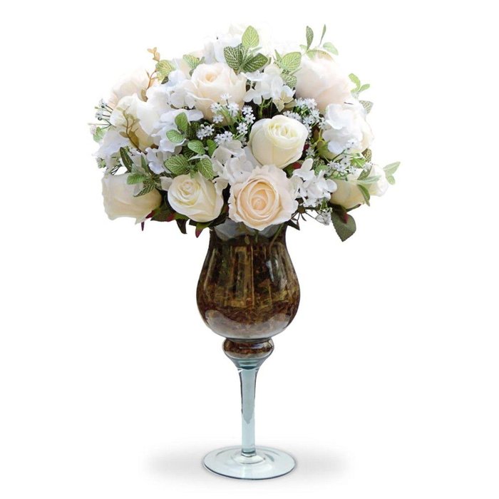 Arranjo Grande Vaso Taça de Vidro Flores Rosas Mistas Branca