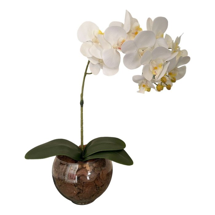 Arranjo de Orquídea Branca Centro de Mesa no Vaso TransparenteArranjo permanente de Orquídea em efeito hiper-realista com vaso transparente.Com 3 folhas, orquídea 3d, cascas e vaso em vidro, esse arranjo é ideal para aparador, mesa de jantar ou banheiro.Tamanho Planta Dobrada:Altura: 42cmLargura: 22cmVaso:Altura: 13cmLargura: 13cmArranjos Exclusivos