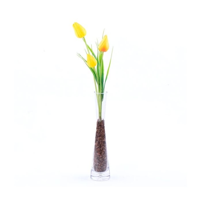 - Tulipas Artificiais com Galhos de fio aramado revestidos em borracha na cor amarela com complemento de capim em plático na cor verde