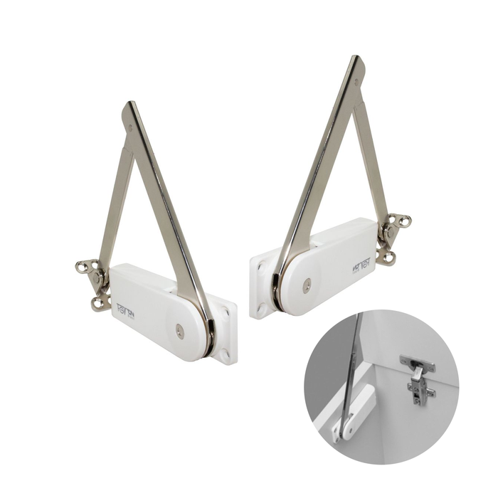 Aplicado em cômodas e móveis com tampas basculantes de abertura vertical de 90 graus. Pode ser montado com dobradiça convencional, dobradiça slide-on reta ou dobradiça oculta embutida ( não fornecida no kit do produto), montagem so do lado esquerdo, ângulo e abertura 90 graus. Não é necessário a instalação de dobradiças com amortecedor.