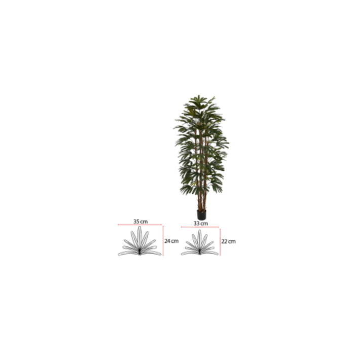 Cada vez mais árvores artificiais estão presentes nas decorações de eventos, comércios e residências. Praticidade, beleza, durabilidade e aparência natural são fortes características desta Árvore Artificial Palmeira Raphis Verde de 1 metro e 50 centímetros de altura. Lindas e grandes folhagens com diferentes nuances de verde que acrescentam exuberância, volume e naturalidade à planta.