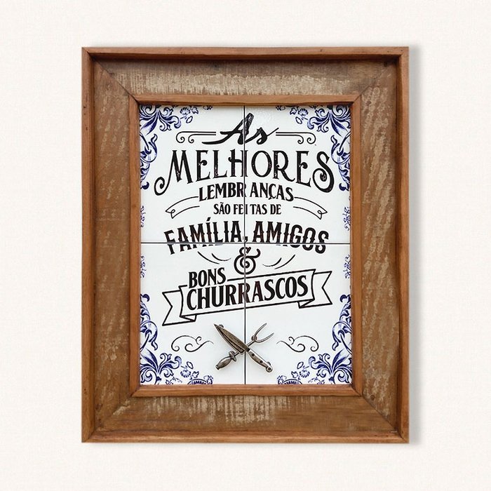 Quadro em madeira de demolição no tamanho 54 X 44 Interior feito em azulejos Com arte artesanal e metais feitos em fundição