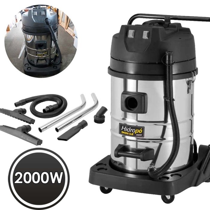 - O Hidropó 2000W possui tanque em aço inox com capacidade de 70 litros, com mangueira para escoamento de líquidos e opera com dois motores de dupla turbina de 2.000 W cada de acionamento individual, proporcionando maior capacidade de aspiração. - - Com rodas para maior mobilidade, é uma opção inteligente para quem busca potência com agilidade.