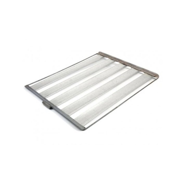 Esteira 58x70 para pão francês 5 tiras 9 cm Melhor opção para a produção de pão de sal (francês), perfurada aumentando para maior absorção do calor. Super resistente, é de fácil manuseio e limpeza Características do produto: Tiras em Alumínio Perfuradas