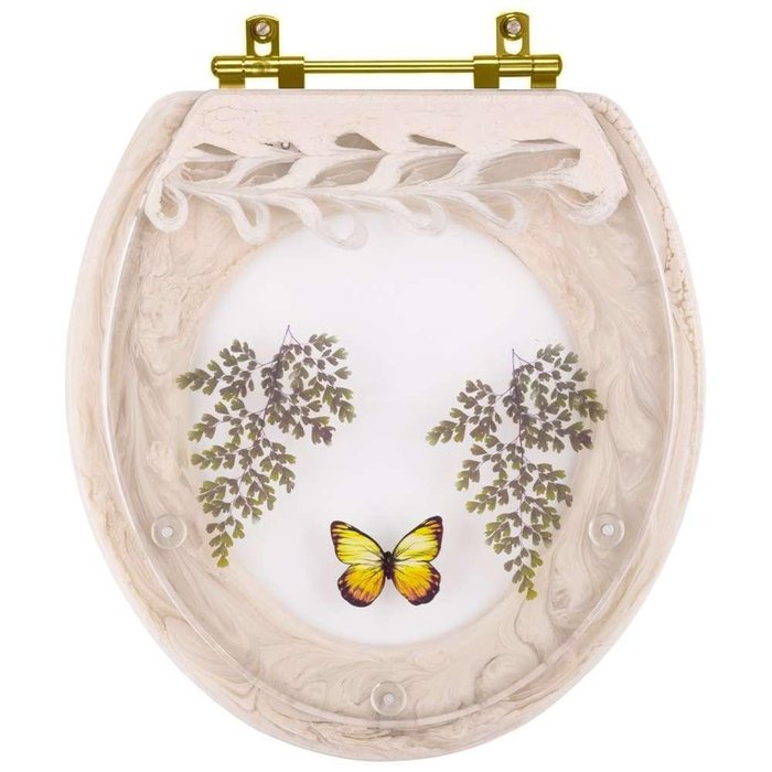 Assento Sanitário Poliester Oval Biscuit Decorado Borboleta Amarela com Ferragem Dourada