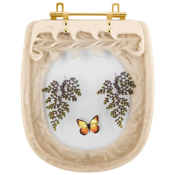 Assento Sanitário Poliéster Sabatini Bege Decorado Borboleta Amarela Com Ferragem Dourada Bege Decorado Borboleta Amarela