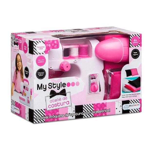 Contém: 1 Máquina de Costura My Style, 3 Carretéis Coloridos, Enchimento, Tecidos, Fita Métrica e Manual de Instruções.