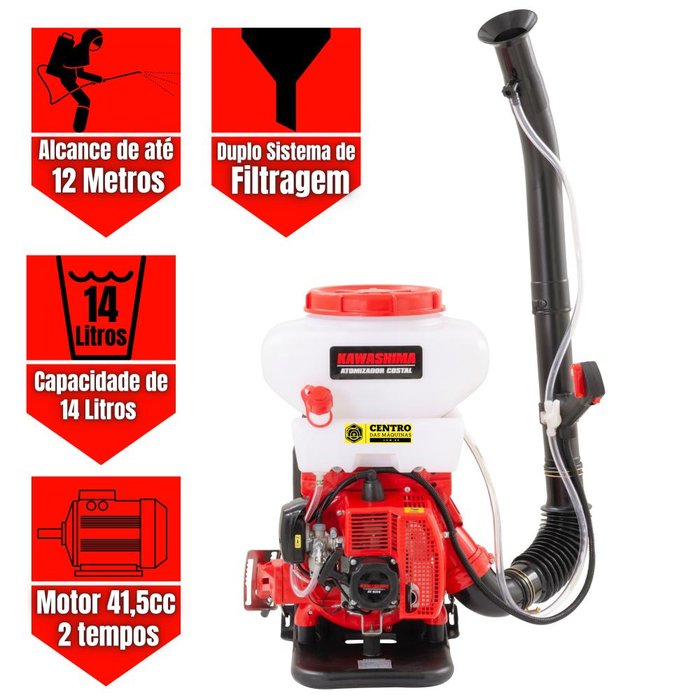 O Atomizador e Pulverizador Costal Kawashima AT4314 é um equipamento de fácil operação e manuseio, sendo ideal para aplicação de pós e líquidos. Com a finalidade de uso em áreas extensas, como na agropecuária, no cultivo de hortaliças, pomares e na desinfecção de ambientes internos e externos, no controle de pragas, doenças e ervas invasoras, bem como adubação e fornecimento de ração para peixes, entre outras utilidades.