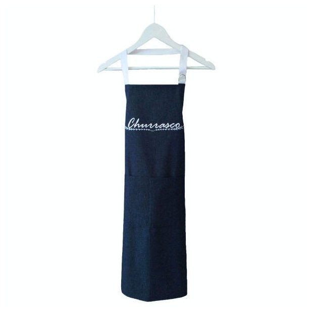 Avental em algodão com estampa " CHURRASCO", com alça de cadarço branco, possui regulador de alça e bolso frontal.