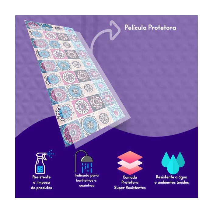 Papel de parede com película de proteção contra respingos de água e umidade do ambiente. A película deixa o papel mais resistente, além de evitar danos contra o papel de parede.
