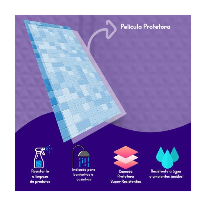 Papel de parede com película de proteção contra respingos de água e umidade do ambiente. A película deixa o papel mais resistente, além de evitar danos contra o papel de parede.