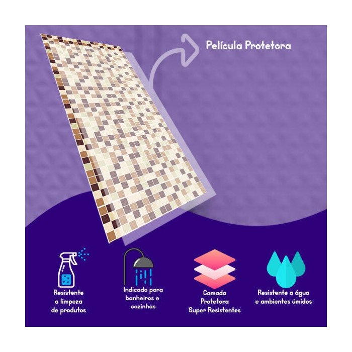 Papel de parede com película de proteção contra respingos de água e umidade do ambiente. A película deixa o papel mais resistente, além de evitar danos contra o papel de parede.
