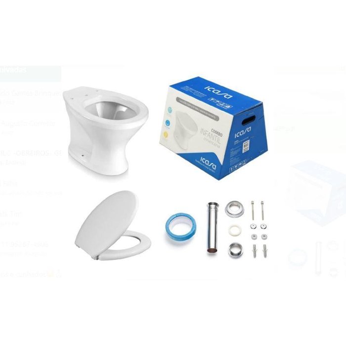Combo Convencional Infantil Icasa, a solução completa para o seu banheiro Bacia, Assento PP, Anel de Vedação com Guia, Parafusos de Fixação e Tubo de Ligação. Tudo em uma embalagem reforçada e prática.