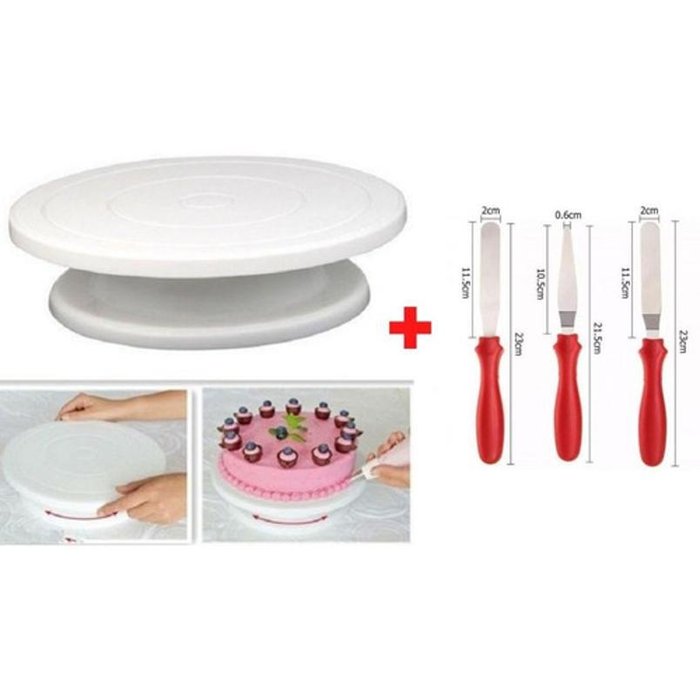 Bailarina giratoria, base para bolo, porta bolo giratório até 10kgs, kit 3 espatulas para confeiteiro. Medida 28,5cm. Altura 8 cm