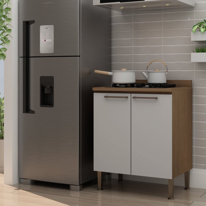 Este balcão possui 2 portas e uma prateleira interna, oferecendo um ótimo espaço para guardar panelas, louças, eletrodomésticos e utensílios de cozinha. Seu tampo de 25mm é perfeito para acomodar micro-ondas ou fornos e também permite a instalação de cooktop.