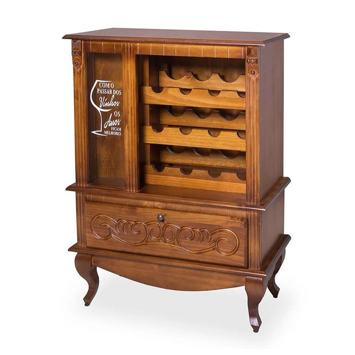 Se você é um apreciador de bons vinhos precisa conhecer o Balcão Adega em Madeira Maciça 1 Gaveta e Pés Luiz XV 5134 Genebra. Produzido totalmente em madeira maciça, possui um acabamento impecável e robustez para durar por longos anos. Neste balcão adega de vinhos você poderá expor até 12 garrafas, ele ainda conta com uma gaveta com corrediças telescópicas e um lindo acabamento entalhado na parte frontal, além do charme dos pés Luiz XV, ele possui um compartimento especial para guardar rolhas, sempre que abrir uma garrafa você poderá guardar a rolha no espaço que conta com um vidro transparente para exibi-las e com o passar do tempo sua adega de vinho de madeira ficará ainda mais linda e charmosa!