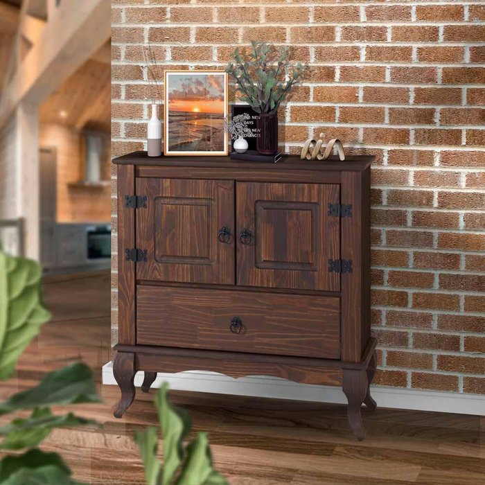 Dimensões do Produto: Largura 80cm; Profundidade 36cm; Altura 84,9cm.Itens Inclusos: 1 aparador.- Madeira maciça- Possui pés com design diferenciado estilo Luis XV (também conhecido como pés cabriolet, ou pés de cabra) que dão ao móvel um visual retrô chique- 01 gaveta- 02 portas com dobradiças metálicas- Puxadores em metal com design retrôComplexidade da montagem: Média, pode ser montado por apenas uma pessoa e/ou necessite de maior conhecimento para montagem.Recomendações de uso, manutenção e limpeza: Limpar com flanela ou pano macio seco, não utilizar produtos abrasivos, desengordurantes, álcool ou solvente. Não expor o produto diretamente à luz solar e à umidadeGarantia: 3 mesesOBS: Foto meramente ilustrativa, objetos, utensílios e decoração não fazem parte do produto.