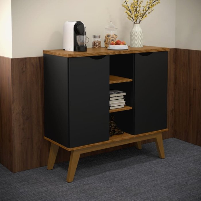 Balcão Buffet 2 Portas 3 Nichos Prism Preto Acetinado/Cumaru