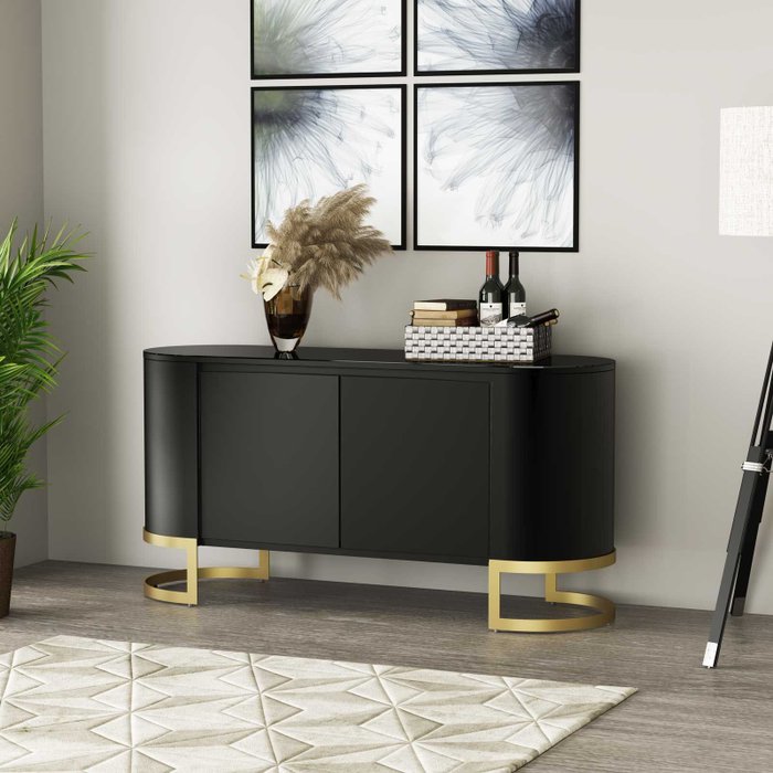 Balcao Buffet 2 Portas Pé Aço Carbono Dourado Light Vidro Pintado Preto Arkadina 1600