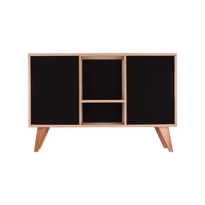 Buffet / Aparador / Balcão Modelo Murano cor Carvalho Treviso com 2 portas Preto, o móvel perfeito para deixar seu ambiente com estilo e organizado. <br><br> Possui dois compartimentos internos com 2 portas laterais e uma prateleira central visível para colocar objetos de decoração. Móvel apoiado em quatro lindos pés torneados em madeira maciça. <br><br> O móvel apresenta um estilo clean sem puxadores, apenas um recorte nas portas para abrir e fechar. <br><br> Montagem: Vai desmontado. <br><br> Cor do Móvel: Madeira Clara (Carvalho Treviso) e portas Preto. <br><br> Cor dos pés: Amadeirado de cor clara. <br><br> Medidas: Largura Total 115cm x Altura Total 77cm x Profundidade Total 40cm, portas A 53cm x L 37cm, pés A 20cm. <br><br> Material: MDP com espessura 1,5cm <br><br> Limpeza: Recomenda-se a limpeza com pano seco ou levemente umedecido. <br><br> Importante: Este anúncio inclui somente o produto conforme descrição acima. Todos os elementos de decoração das fotos não acompanham o mesmo. <br><br>