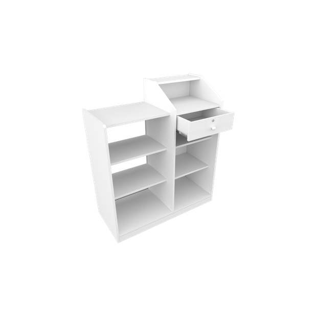 O balcão caixa foi desenvolvido especialmente para atender com eficiência lojas de diversos segmentos: moda, papelaria, perfumaria, bazar, eletrônicos e muito mais. Seu design moderno na cor branca combina facilmente com qualquer ambiente comercial.