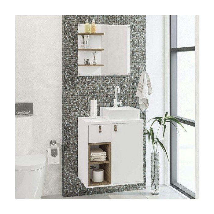 Balcão com Espelho para Banheiro com Cuba, Kit Hidráulico e Torneira Macaé Politorno Branco/Castanho