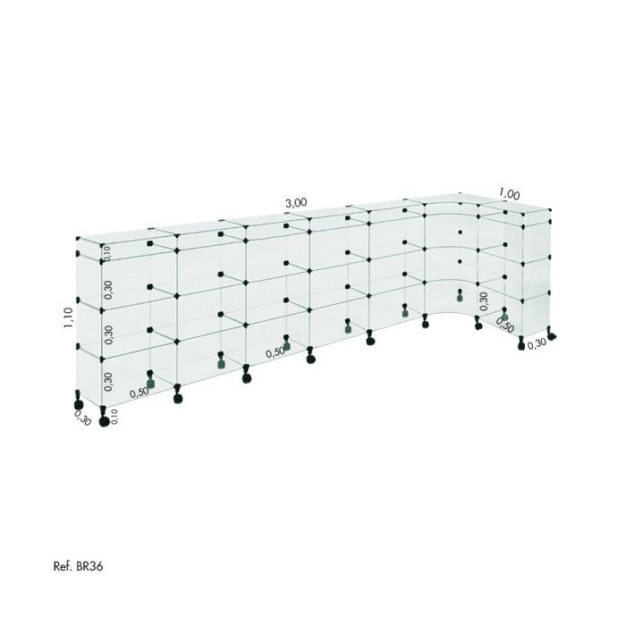 Balcão de Atendimento tipo 'L' Modulado em vidro temperado de 4mm com rodízios no tamanho 3,00 x 1,10 x 1,00 e com 21 casulos. Ideal para Atendimento ao público e exposição dos mais variados tipos de produtos.
