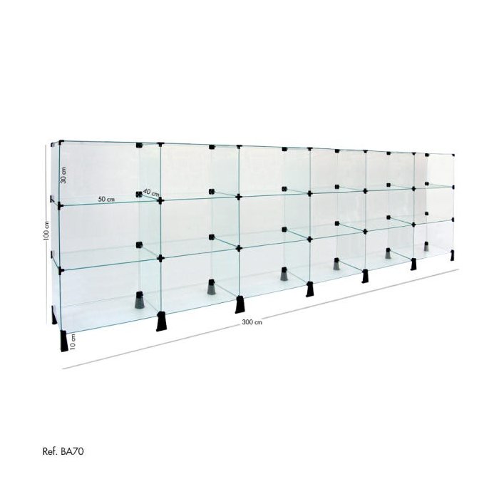 Balcão de Atendimento Modulado em vidro temperado de 4mm com bordas tratadas e 18 casulos de 0,30 x 0,50. Balcão ideal para lojas de roupas, papelaria e afins.