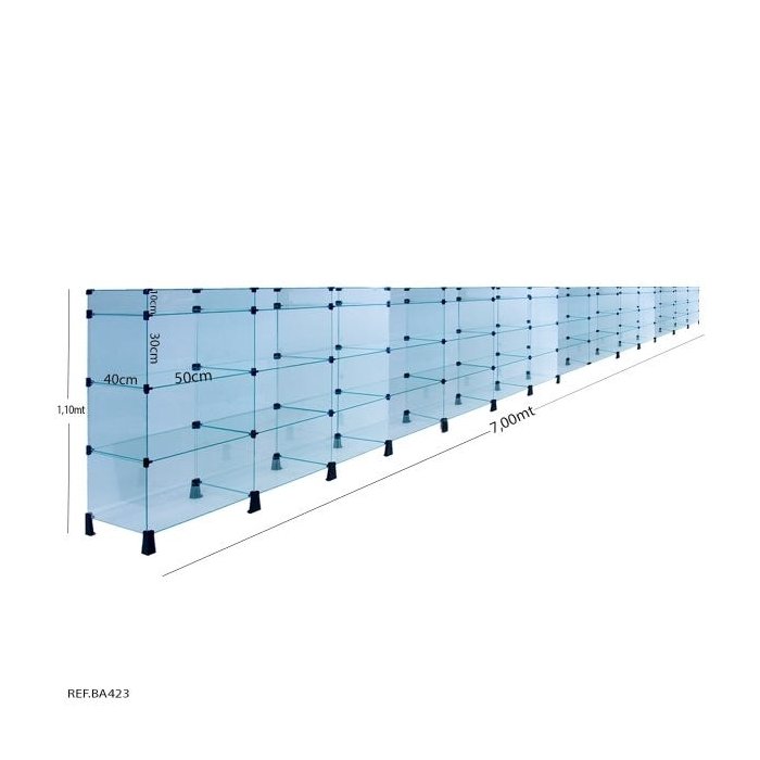 Balcão de atendimento modulado em vidro 4mm temperado com bordas tratadas e porta bijuterias, com 7,0 x 1,10 x 0,40, possui qualidade e sofisticação dos produtos originais balcãonet.