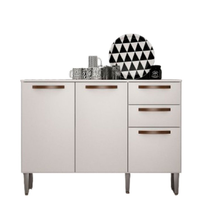 O Balcão Maísa 3 portas é ideal para organizar seu espaço com praticidade e rapidez. O armário conta com 3 Portas com dobradiças metálicas, 1 prateleira, puxadores em abs bronze, pés reguláveis e2 gavetas com corrediças telescópicas para ajudar na organização. O balcão possui um design elegante para complementar sua cozinha ou despensa.