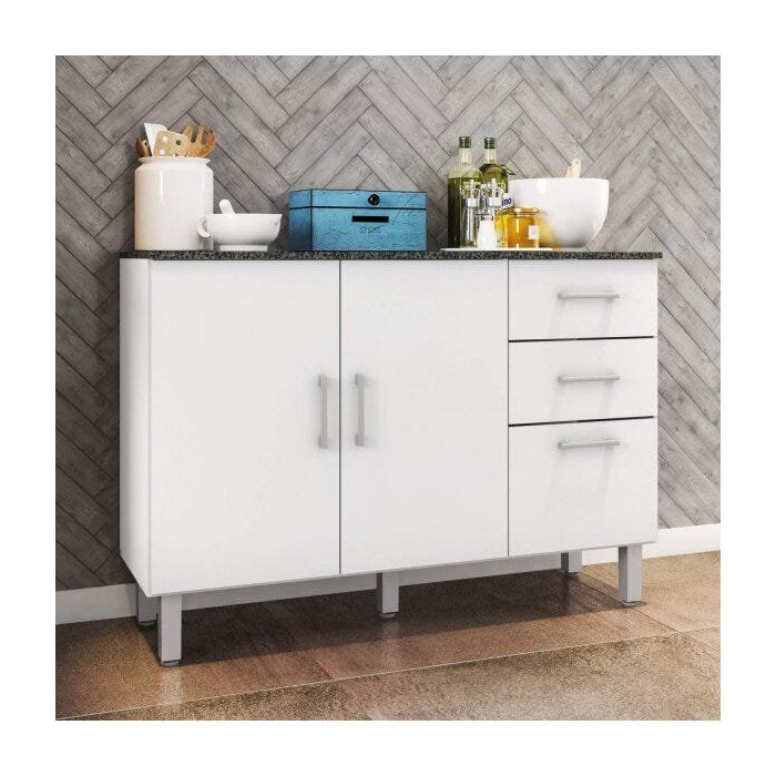 Balcão de Cozinha com Tampo 3 Portas 2 Gavetas Suíça Poliman Móveis Branco
