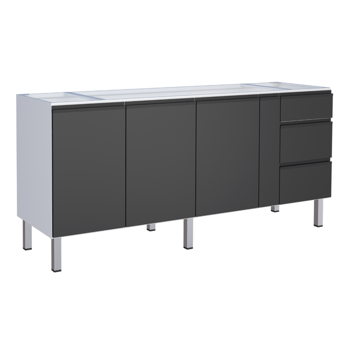 O Balcão para pia destaca-se por sua praticidade e eficiência de uso, podendo ser utilizada como complemento de cozinha. Estrutura em Aço em eletrogalvanizado. Possui 3 portas, 3 gavetas com corrediças telescópicas e divisor de talheres, 1 prateleira e contém porta condimento. Não acompanha tampo Dimensões do Produto: Altura: 91 cm Largura: 195 cm Profundidade: 54 cm Informações do Produto: Cor: Preto Portas: Sim (3) Gavetas: Sim (3) Corrediças Telescópicas Possui divisor de talheres Pés: Sim (6) Alumínio com Regulagem Prateleiras: Sim (1) Puxadores: Sim (7) Alumínio Porta Condimento: Sim, possui Material Principal: Aço Não acompanha tampo Dobradiças com amortecimento Itens Inclusos: 1 Balcão Manual de Montagem Kit completo para montagem e manual de instruções Garantia: 3 meses contra defeito de fabricação Informações Adicionais: - Fotos meramente ilustrativas do produto no ambiente. - Os objetos que ambientam as fotos não acompanham o produto; - Verificar descrição e tamanho do produto antes da compra. - Avaliar a mercadoria no ato do recebimento e recuse em caso de divergência ou avarias. - Mantenha as informações de contato e endereço de entrega atualizados para entrarmos em contato caso necessário. - Limpar com flanela ou pano macio seco, não utilizar produtos abrasivos, desengordurantes, álcool ou solvente. Não expor o produto diretamente à luz solar e à umidade. * Sugerimos a contratação de um montador profissional para a montagem do produto. Não nos responsabilizamos por avarias causadas no ato da montagem. * Não nos responsabilizamos pela montagem e desmontagem do produto no ato da entrega e devolução, assim como os custos gerados nestas situações. * A transportadora entregará o produto no andar térreo do endereço de entrega. * Não nos responsabilizamos por subir escadas, corredores e elevadores ou transporte por guincho em apartamentos.
