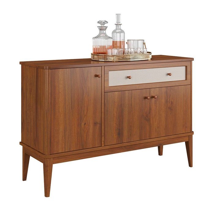 As gavetas contam com um acabamento em telinha de Rattan, chamada também de Palhinha Natural, são fabricadas manualmente, o que confere a elas padrões únicos e um toque de sofisticação. Produzidas a partir de fibras naturais de celulose ou algodão, essas telinhas combinam durabilidade e elegância, mantendo sua autenticidade e aparência natural ao longo do tempo, enquanto os cantos arredondados do móvel promovem mais estilo e conforto. Projetado para otimizar o espaço na cozinha, este móvel versátil se adapta perfeitamente a diferentes ambientes, trazendo um toque de sofisticação que transforma qualquer espaço.