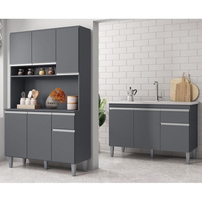 Balcão de Pia Tatiane 120m Sem Tampo e Cozinha Kit Márcia Compacta Cinza Ajl Cinza