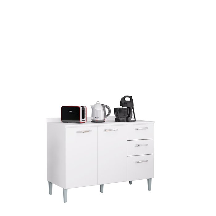 Um produto moderno e com valor custo-benefício. Produzido em madeira MDP, possui 2 portas com dobradiças metálicas e 3 gavetas com corrediças metálicas. Sem contar no amplo espaço interno com prateleira e compartimento muito bem divididos para você guardar alimentos, panelas, eletroportáteis, louças entre outros utensílios de forma organizada.
