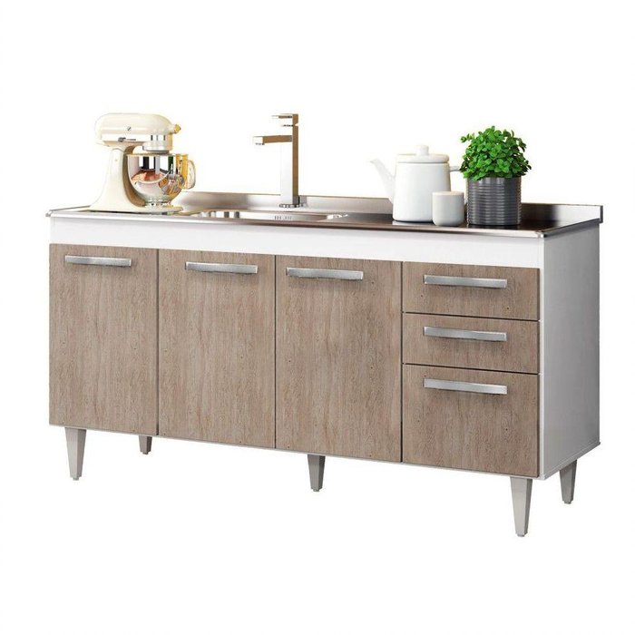 Balcão Gabinete Lisboa e Pia Inox 150cm Branco e Castanho Branco