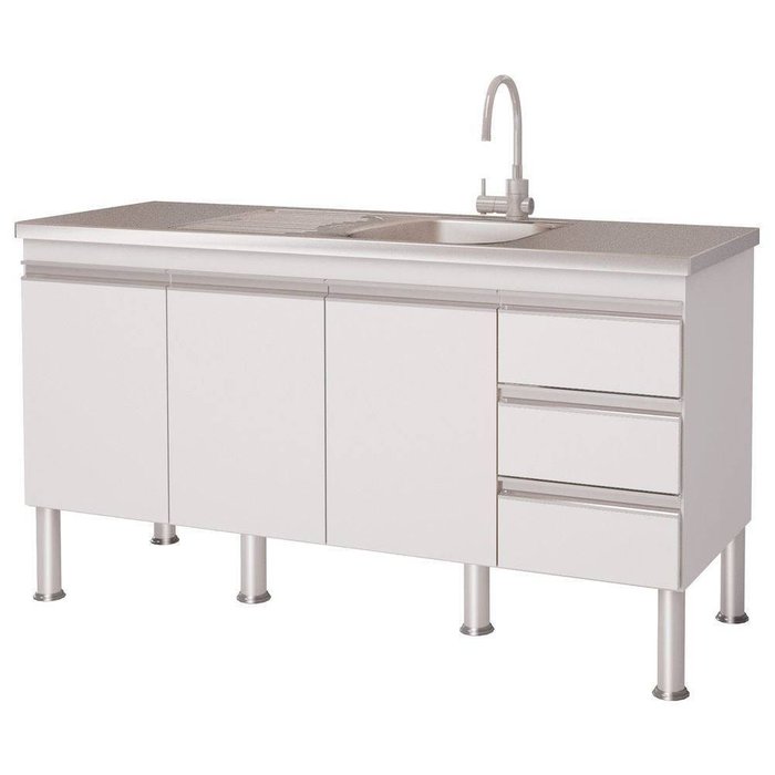 Balcão para cozinha, com 3 portas e 3 gavetas, prateleira interna puxador em perfil alumínio, corrediça telescópica e porta talheres.Gaveta e Porta produzidas com Mdp de 15 mm, Caixa Mdf de 12 mm, fundo Duratree de 2,5 mm.Não acompanha torneira, Pia ou tampo superior.