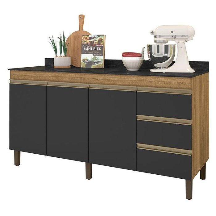 Balcão Karen 159cm 2 Portas 3 Gavetas Nature/Preto com Tampo MDP - Peternella Móveis