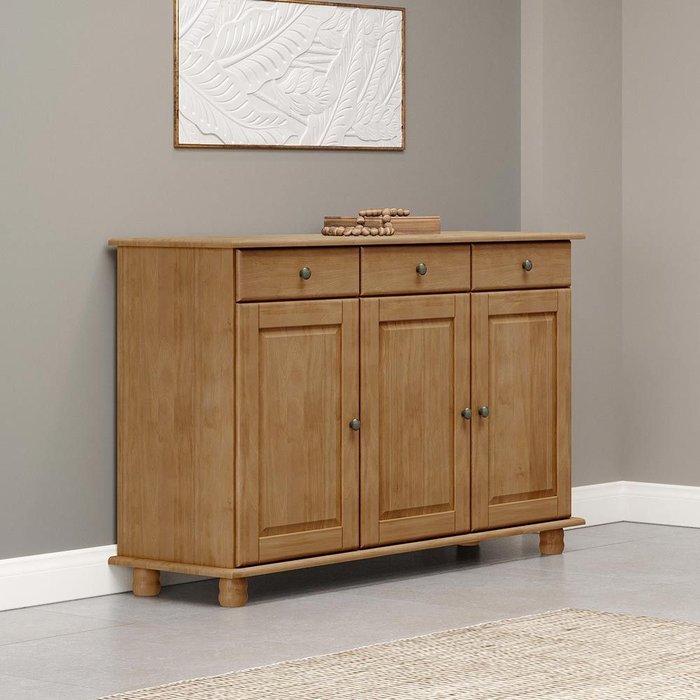 O balcão é uma peça funcional e sofisticada, ideal para compor cozinhas, salas de jantar ou ambientes gourmet, oferecendo organização e estilo. Sua estrutura é produzida em madeira maciça de pinus de reflorestamento, um material resistente e sustentável que confere durabilidade e um aspecto natural ao móvel. O acabamento é realizado com pintura acetinada, protegida por verniz PU e UV, proporcionando uma superfície lisa, agradável ao toque e resistente ao uso contínuo. O design conta com cinco pés que garantem estabilidade e facilitam a limpeza do espaço. Composto por três portas e três gavetas, o balcão oferece amplo espaço interno para armazenar utensílios, louças e diversos objetos do dia a dia. As prateleiras internas suportam até 10 kg, enquanto cada gaveta suporta até 5 kg, permitindo o armazenamento seguro e organizado dos itens. Os puxadores metálicos em ouro envelhecido acrescentam um toque de elegância ao design, destacando-se como um detalhe refinado. As portas são equipadas com dobradiças com amortecimento, que proporcionam abertura e fechamento suaves, aumentando o conforto no uso. As gavetas contam com corrediças telescópicas, garantindo um deslizamento seguro, silencioso e eficiente. Este balcão é a escolha ideal para quem busca aliar qualidade, resistência e estética, transformando o ambiente com funcionalidade e charme.
