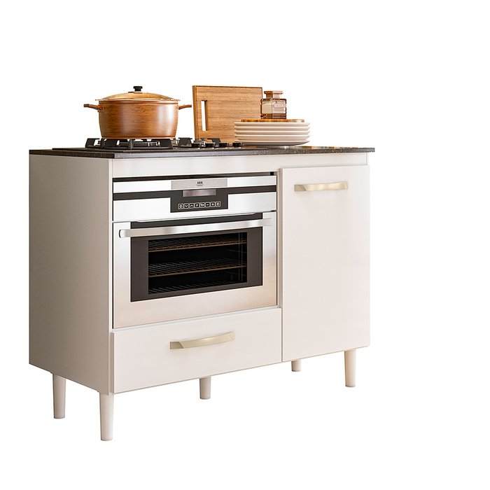 O Balcão possui 1 porta e 1 gaveta, espaço para forno, super compacto, ideal para pequenos espaços. Sua estrutura em MDP trará mais durabilidade ao produto.