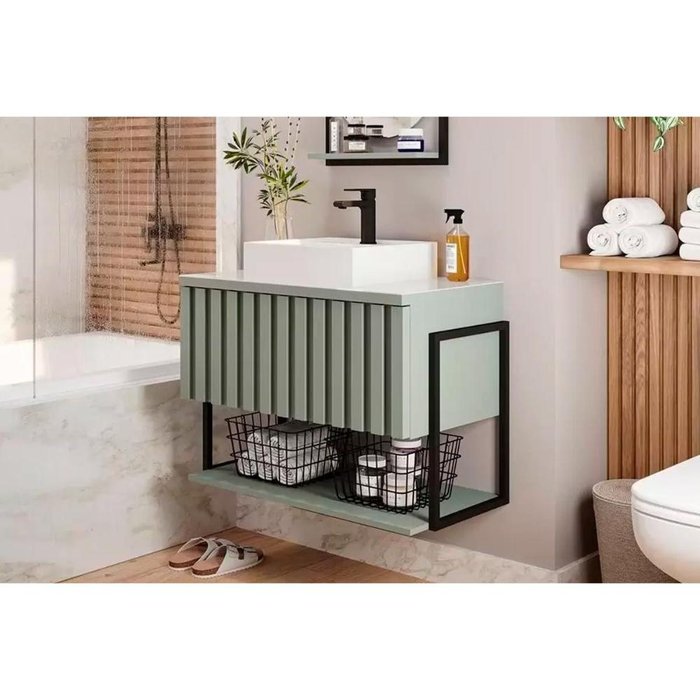 Balcão P/ Banheiro Suspenso Frisê Havaí Ripado 1pta Basculante C/cuba e Tampo Vidro 80 Cm Cor Pistache