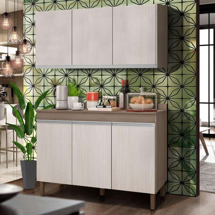 Dimensões do balcão: Largura 119 cm; Profundidade 52 cm; Altura 86 cm.Dimensões do armário: Largura 119 cm; Profundidade 32 cm; Altura 61 cm.Itens Inclusos: 1 balcão e 1 armário aéreo- Duas peças: balcão e armário aéreo- Acompanha tampo- Caixaria e frente com pintura fosca- Tampo com pintura alto brilho- Amplo espaço interno- Dividido em prateleiras internas- Possui 6 portas- Pés com regulagem- Design clássico- Produto 100% MDP de 15mmComplexidade da montagem: Média, pode ser montado por mais de uma pessoa e/ou necessite de maior conhecimento para montagem.Recomendações de uso, manutenção e limpeza: Limpar com flanela ou pano macio seco, não utilizar produtos abrasivos, desengordurantes, álcool ou solvente. Não expor o produto diretamente a luz solar e à umidadeGarantia: 3 mesesOBS: Foto meramente ilustrativa, objetos, utensílios e decoração não fazem parte do produto.